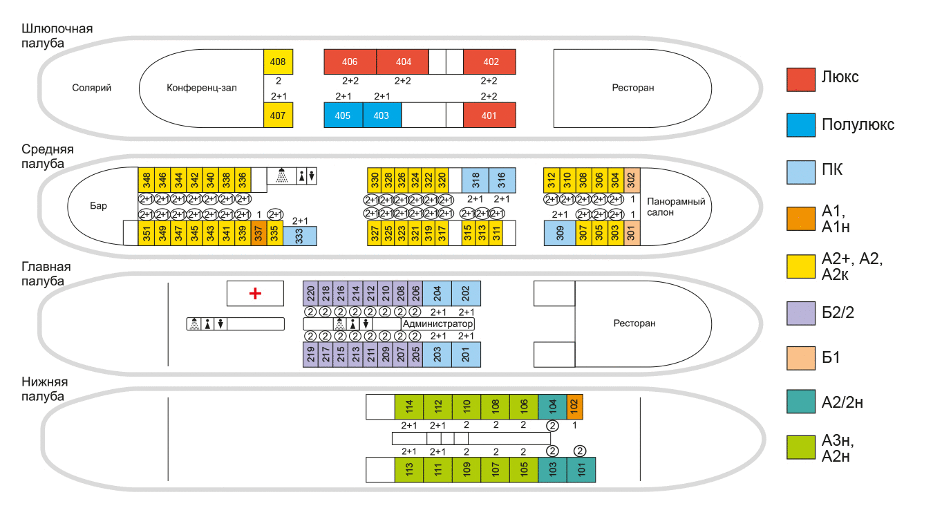 К каютам категории А2 относятся следующие номера кают: 303–308, 311–313, 315, 317, 319–328, 330. Двухместная каюта со всеми удобствами, расположенная на средней палубе. В каюте: два спальных места, душ, туалет, раковина, кондиционер, холодильник, шкаф для одежды, радио, розетка 220 V. Дополнительное спальное место – откидная полка верхнего расположения
